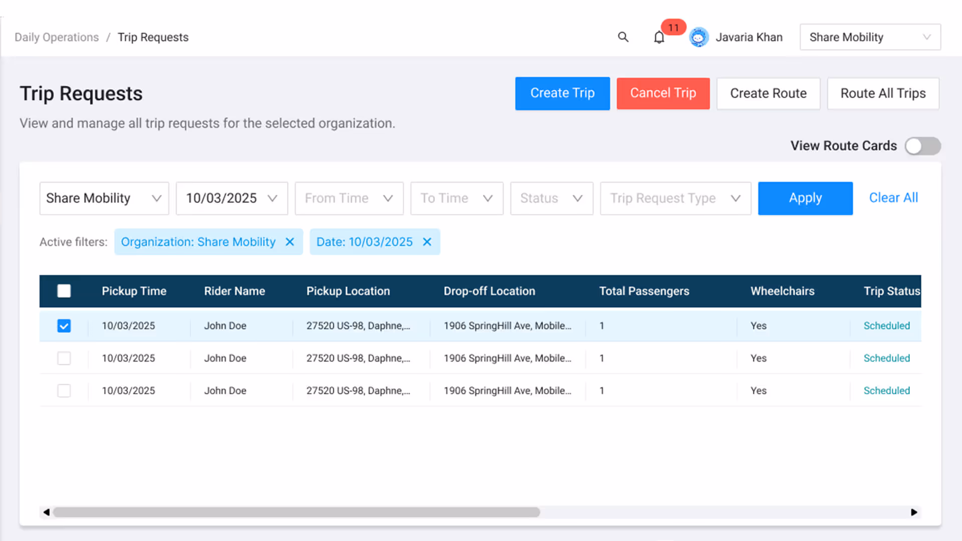 Last-minute changes no longer cause chaos. Dispatchers can reassign trips, update timing, or cancel requests in real time—without losing visibility or disrupting the rest of the schedule.
